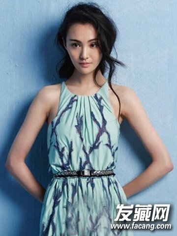 浅蓝色的连衣裙,肚兜款式设计,个性复古,长发随性绑出微卷感,肆意性感魅惑。