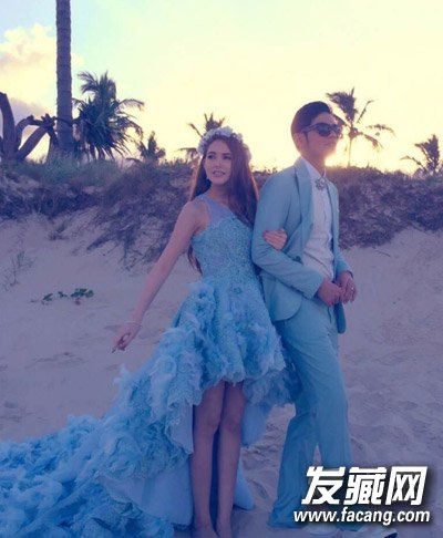 周杰伦昆凌澳洲婚礼造型,拖地鱼尾长裙大秀好身材,披肩长卷发甜美动人,蓝色花朵修饰,更显少女感。