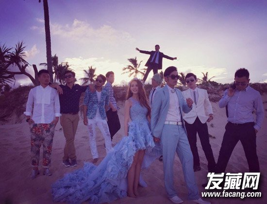婚礼现场图,新人与友人合影,湖蓝色礼服在其中很是抢眼,沙滩风情格外迷人,周董短发帅气十足,卷发的昆凌小鸟依人。