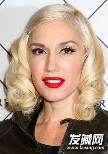 及肩短发烫出复古的浪漫大卷,显得弹性十足,刘海用小小的边夹点缀出丝丝少女气息。又是一款是金发加红唇的经典搭配,摩登又时髦,更让Gwen Stefani有了些“梦露”的即视感。