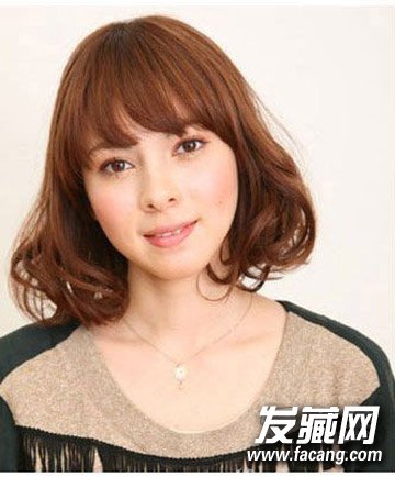 通过发尾内扣式的卷度,修饰肉肉的娃娃脸,同时也增加了乖巧感。深色的染发加上修饰不多的齐刘海,更是增加甜美度的法宝。
