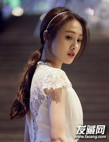 中分刘海烫出微卷的弧度,恰到好处的勾勒出一张瓜子小脸。低垂的卷发马尾搭配晶莹的发箍,精致迷人。