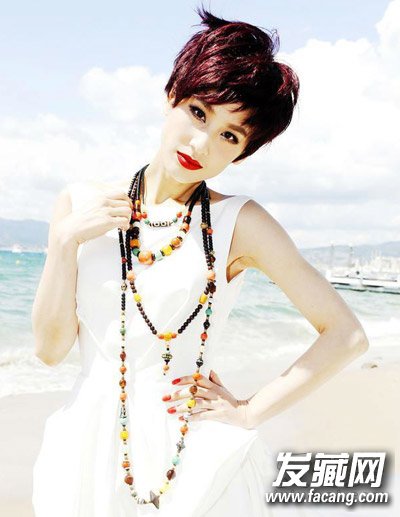 个性短发发型,红棕的短发配上红唇,很显时尚个性,搭配白裙秒变犀利少女,上翘的眼角透着一股小性感。