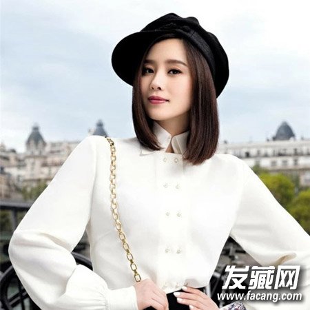 中短发波波头整齐自然,微微内扣的设计修饰出一张精致的瓜子小脸,搭配一顶斜戴着的黑色帽子,演绎出巴黎浪漫风情。