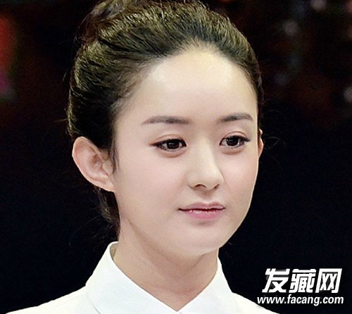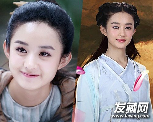 电视剧照造型,中分半扎发搭配白衣仙气十足,简单束发造型可爱呆萌,小圆脸的赵丽颖就是要露出额头才好看。
