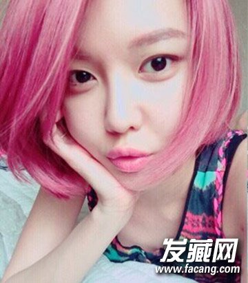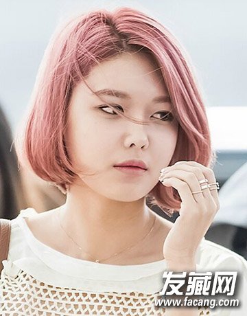 而秀英的Bob发型更短也更甜美,齐耳的长度俏皮清爽,随性的侧分搭配特别的樱花粉发色,时髦又精致。