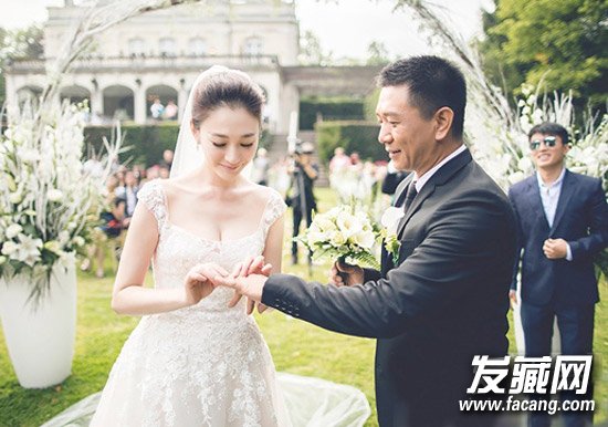 新人交换戒指,光洁的盘发低头的时候更显风情,像李小冉这样的气质美女,就是适合没有的刘海的发型。