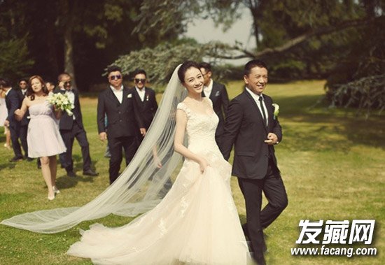 新人合照,这样看李小冉的新娘发型更显仙气了,拖地的头纱在背后描绘出一番如诗如画的美景,配上蓝天白云,宛如大片。