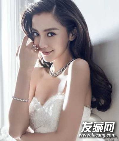 嫩模出身的angelababy,卷发很是妩媚,这样侧分长卷发发型很显高贵气质,个性卷发配上抹胸婚纱,性感不失时尚感,很赞的一款新娘发型。