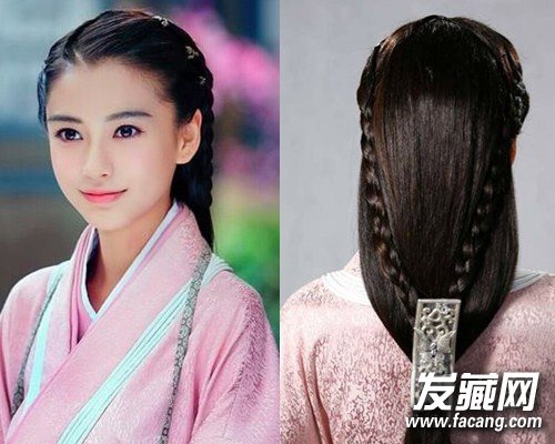 我们来具体分析下大汉发型,整齐扎起的发髻显得平整利落,旁边的一小簇麻花辫增添了人物的活力。这款发型很好地突出了AB纯情的少女时代,发尾夹杂小麻花辫然后用方形配饰固定,古典与俏皮并存,整体造型自然纯净,在粉绿色汉服的衬托下,格外清新儒雅。