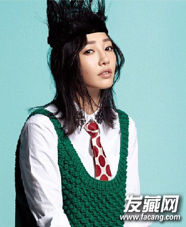 齐发及肩黑发,随意散落在肩上,搭配白色衬衣格子领带,趣味十足。
