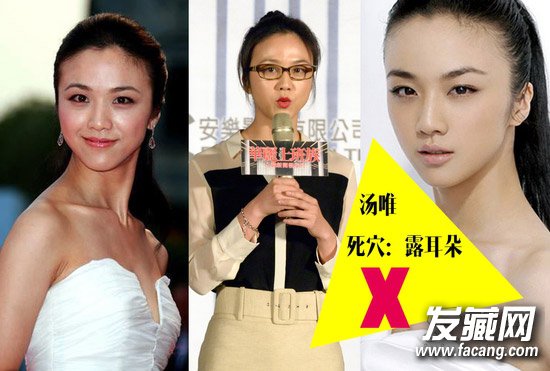 汤姑凉长了一张少见的六边形脸,比一般人要宽 因此耳侧的修饰就非常重要,如果把耳朵两侧的头发全部梳起来没了遮挡就是自寻死路。