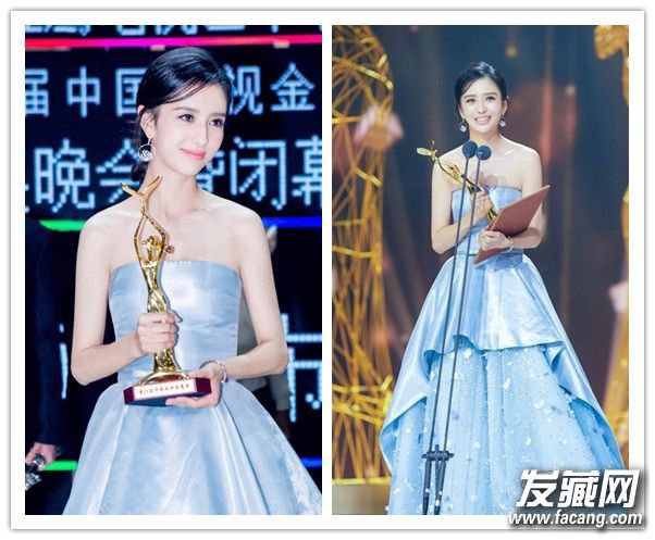 还记得之前在金鹰节上的造型吗?偏分刘海低马尾+荧光色礼服很少女呢,清新养眼。