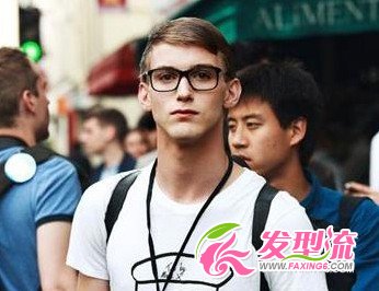 贴服的分界刘海流露复古的气息,两旁的头发也用定型产品制造贴服感,使整个发型有旧时代的绅士感觉。搭配时尚的粗框眼镜,显得斯文得体。