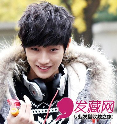 刘海微微蜷曲,秀发柔顺而发亮。 黑色的短发是男士发型的最爱,没有华丽的染发更加显清爽干净的男生气息,这样是不是很有韩流范儿。
