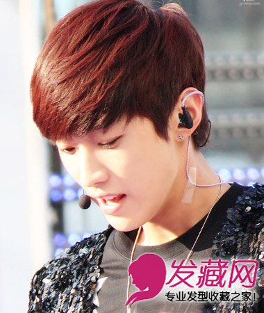 这款韩国男生发型中经典的蓬松的纹理烫短发发型,亮眼的酒红色染发时尚潮范儿,红色染发最显肤白,清新俊朗。
