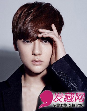 清新十足的斜刘海短发型,深栗色的染发看起来非常整洁帅气,厚重的刘海恰好适合长脸型的男生,发根简单的定位烫发完美诠释出优雅阳光男孩气质。