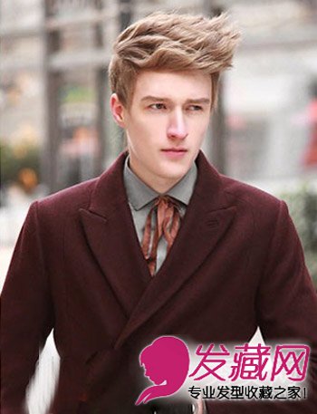 对于欧洲人天生白色皮肤,搭配亮系的染发颜色更添魅力,长长的刘海用发蜡打造出酷酷的飞机头,搭配毛呢大衣,型男范尽显。