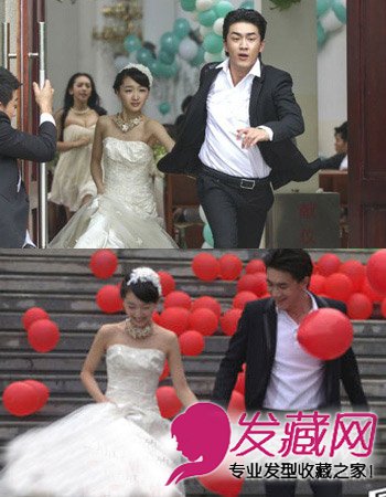 林更新新郎装造型,不羁的短发,黑色西装白衬衫,帅气成熟,周冬雨新娘盘发甜美可人。
