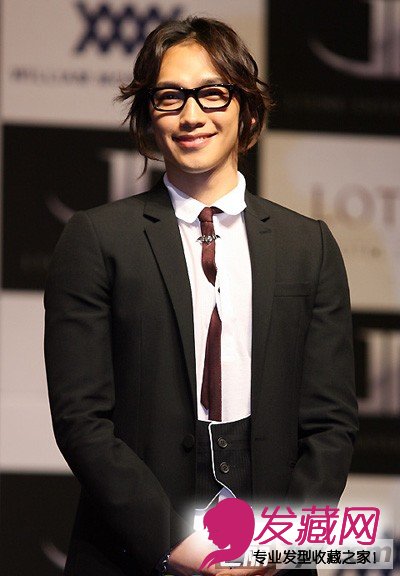 小编点评:Rain的扎发发型也不是很常见哦!随意自然的马尾,分出两边较长的刘海修饰脸型,戴上眼镜,穿上西装的Rain看上去很CEO哦!