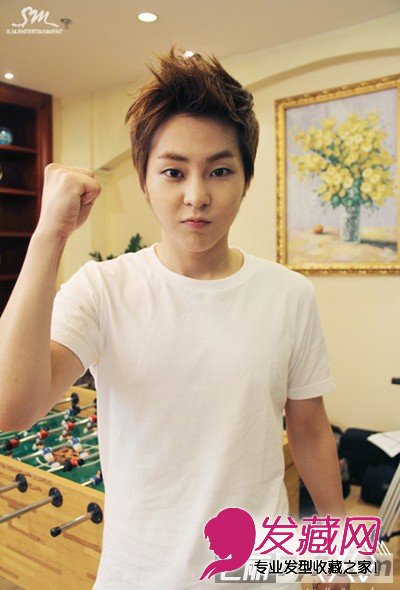 小编点评:XIU MIN金珉硕,烫发电发用抓发抓成复古发型飞机头的感觉,刘海上翘的短发造型,阳光感的邻家男孩形象,露出额头的设计,简洁清爽,头顶抓松更显动感活力。