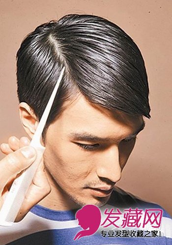 霜状发胶涂抹全发以增添光泽,再用尖尾梳尾端将头发以1:9分线,并且由分线往两边梳整头发。