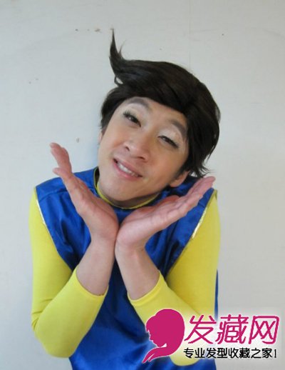 斜分刘海向后竖起,其余则梳向后,造型明明很雷人,却摆出这么纯情的表情,除了搞笑真的不能说什么了。