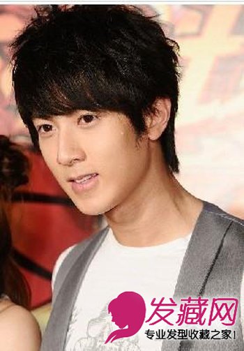 直发上细致的立体造型马上令男生发型时尚加分,些许外翘的短发是呈现动感,侧分刘海是吴尊不变的发型