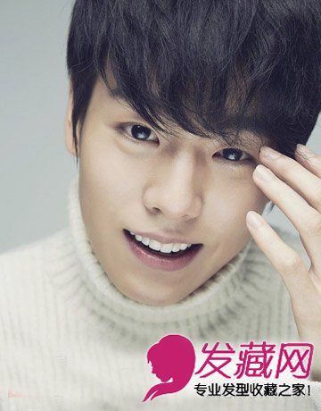 偏分的刘海发型自然的贴在眉间,微翘的烫发发丝打出层次,时尚又清新,穿搭毛衣,笑容阳光,暖男范十足。