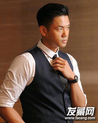 两边的头发几乎铲平,将中间发丝向后梳理光滑,制造出背头的感觉,有一种浓厚的复古味道在内,充满型男魅力。