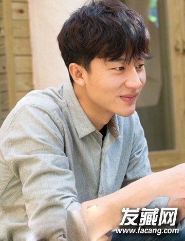 韩范的男生纹理烫发型,加上呆萌的齐刘海,棕色发色下更衬托出暖男的温柔气质,简洁灰色衬衫,从容帅气。