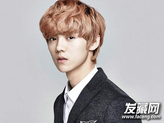 很有个性的一款短卷发,金橙发色很有光泽和质感,萌萌的厚刘海衬托出鹿晗小巧的脸型和精致的五官,头顶蓬松的烫发十分别致。