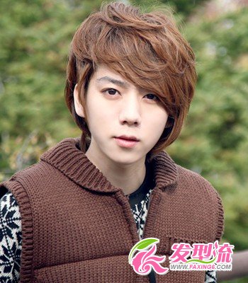 棕色染发衬托出男生白皙的皮肤,将头顶表面的发丝制造出些微的凌乱感。斜刘海顺着眼角遮盖住耳朵,两侧不对称的发丝彰形成视觉上的对比效果。原本看起来有些肉肉脸的的脸型,瞬间也减小了面积,打造出乖乖男的形象。