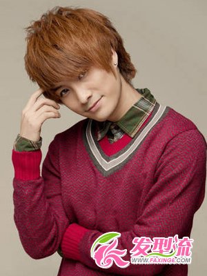 温柔男生是马晨龙给小编的第一印象,这款男士发型同样诠释了马晨龙这样的温柔情节!靓丽的棕黄色染发散发出一种非主流的感觉,很适合他这款枚红色的服饰!微微遮住眼帘的覆盖式斜刘海增加多了一点神秘气息!