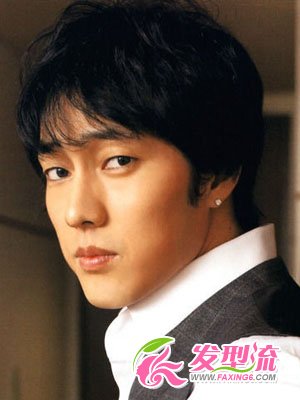黑色覆盖式的斜刘海有效地遮挡他有点偏长的脸庞!头顶堆砌出来的纹理注入了时尚的元素,让他整体散发出时尚的视觉效果,搭配淡紫色的西装,潮男一个!