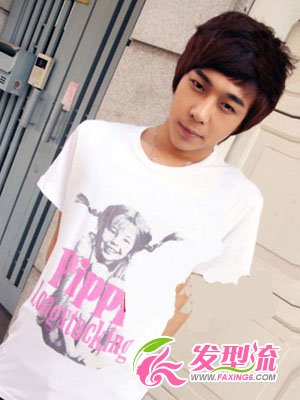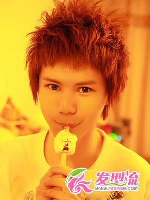 个性及造型感特别强的非主流发型很适合90后的男生们,夸张的发型设计有点竖起的感觉!竖直而立的鬓角与齐刘海将男生的脸型以最大作用的修饰,较短的刘海设计露出男生干净的眉目和可爱的眼睛,搭配T同样很出彩!