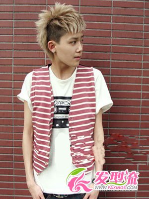 在追求个性与造型感的同时不忘增添时尚潮流气息的一款短发发型,较为浮夸的发色以及大胆的发型设计让这款发型独一无二,有种专门为个性男生打造的一款流行发型!搭配条纹马甲和T,酷范儿十足!