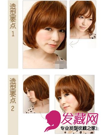 造型要点1:将侧发发尾向前沿着下颚线打造流畅圆润的线条,能让脸显得更小巧可爱。刘海部分增加发量的堆积,并利用保湿摩丝来打造光滑丝质感。