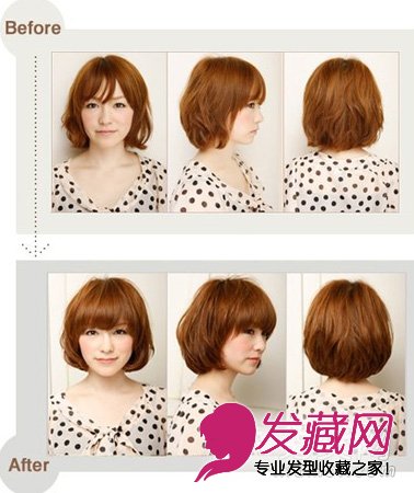 造型前后对比:之前的造型虽然很有湿漉漉的纹理感,但不够蓬松、重点也不够突出,搭配原有的长脸就更没精神。造型后让巧克力色的染发更有光泽感,更增加了头发的空气感,让造型更圆融蓬松,成年女性也能显得更可爱更富有朝气。