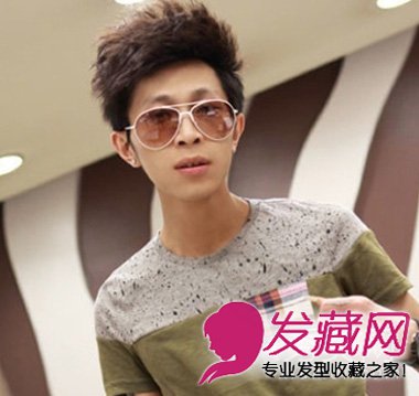头部的短发经过烫发的作用,整体往上高高翘起,打造出一种蓬松的效果,显得立体感十足,短碎发衬得男生阳光帅气,无刘海的发型设计,露出了男生光洁的额头,展现出了男生帅气的五官,一副时尚墨镜的佩戴,增添了浓厚的时尚气息。