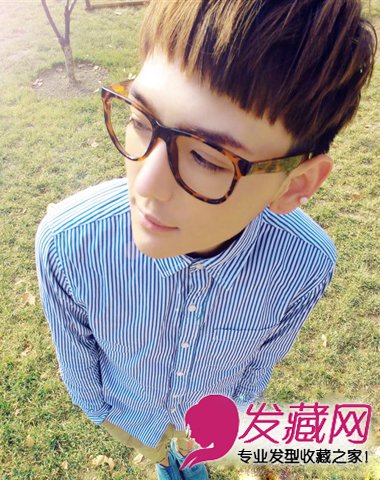 男生萌系发型中最具代表型的蘑菇头,齐整的短刘海呈现出俏皮可爱感,好看的棕色发色,戴上豹纹款的大镜框,一件衬衫,清晰文艺范十足。
