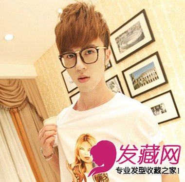 这款男生烫发低调沉稳,毫无夸张之感,是属于阳光男生的一款发型。头顶的头发稍显蓬松,拉长了男生的脸部轮廓,让整个人看起来更加有精神,棕黄色的染发散发出阳光的味道,搭配一副方框眼镜,更显帅气。