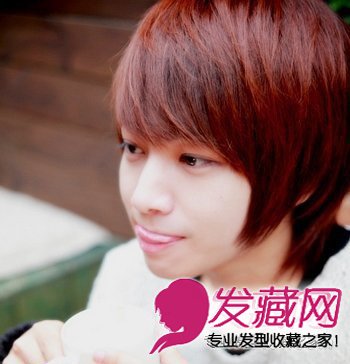 在柔顺的直发发型基础上,加入红棕色染发颜色,惹眼的红棕色闪烁着金属光泽,同样紧包裹住脸颊的鬓发长而柔顺,衬托出男生秀气的脸庞,凸显了发型与脸型搭配。