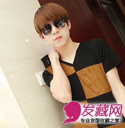 发顶位置的线条,呈现出向上翘的效果,在金棕色的发色衬托下,显得帅气十足,厚重感的斜刘海搭配,更增添了一股型男范的男士短发。