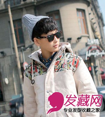 厚重的齐刘海遮盖住额头,将脸型修饰得更加精致小巧,蓬松的短发烫发厚重饱满,质感十足,搭配一副黑色墨镜,尽显时尚型男气息。