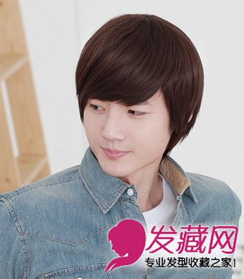 这款短发造型,厚重齐眉的斜刘海,很好的修饰了脸型。棕色系的染发颜色,在灯光的照耀下,突显了男生白皙的肤色,非常阳光。