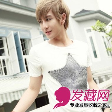 很浅的棕黄色短发比较偏向于肤色偏白的男生,斜斜地刘海有着稍微的碎发效果,很是柔顺的秀发方向使整个发型都有着很流畅的感觉。稍向耳边斜的柔顺刘海,将秀发的完整度做了更细致的调整,做为特色的棕黄色短发设计给人很是阳光的感觉。
