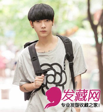 典型的一款阳光大男孩短发造型设计,厚重的齐刘海发型加上健康自然的发色,在不添加任何的染发颜色的同时,很好的展现男士帅气阳光的气质。