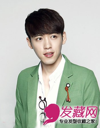 精致的倒三角形的脸型清秀迷人。一款帅气的韩国男士发型设计,厚重的齐刘海微露眉眼更显清爽。搭配上清新绿色更显气质。