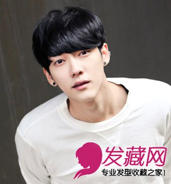 这一款发型设计是韩国男生比较喜欢的一款,简单的斜刘海发型在将略微的发丝打造出些许凌乱感显出男生气质的一面。而长相清秀的男生很容易就能hold住这款发型。